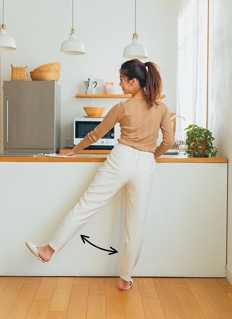 キッチンの掃除中に、片足を1秒かけて横に上げて、1秒かけて元に戻します。足を上げる高さは、お尻の側面に「キュッ」と力が入るくらいまで。