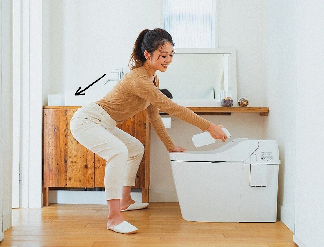 便座の前に立ち、ひざとつま先の向きがズレないよう、お尻を突き出してひざを曲げます。後ろももとお尻の下側に力が入るのが正解。