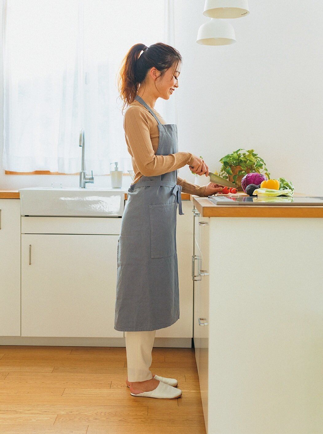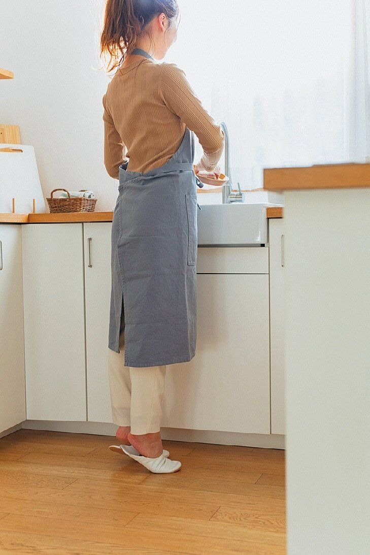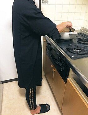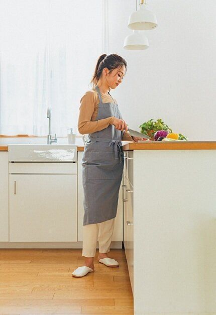 料理中は、体を調理台からこぶし1つ分離して、自分の腹筋で立つのを意識。両足に均等に体重を乗せて立つだけで腹筋が使われるので、ぽっこり下腹を解消できます。