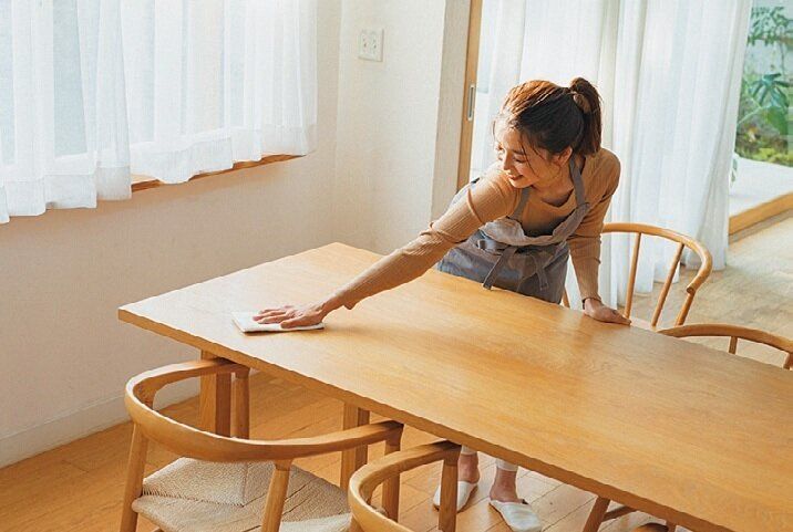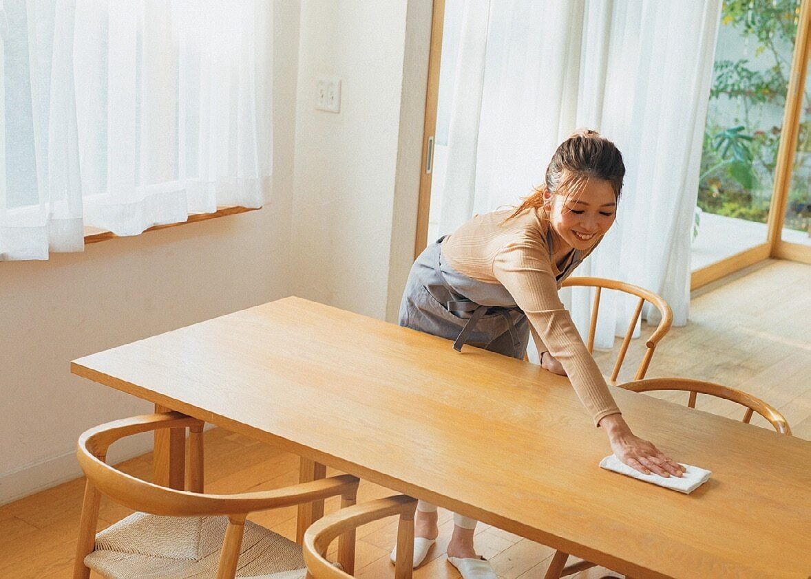 テーブルを拭くついでにほっそり腕に