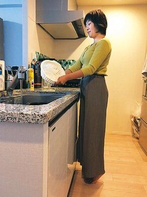 食後の皿洗いは、かかとを上げてつま先立ちで。料理中の立ち方と同様に、体を台にくっつけて腹筋をさぼらせないのもポイントです。