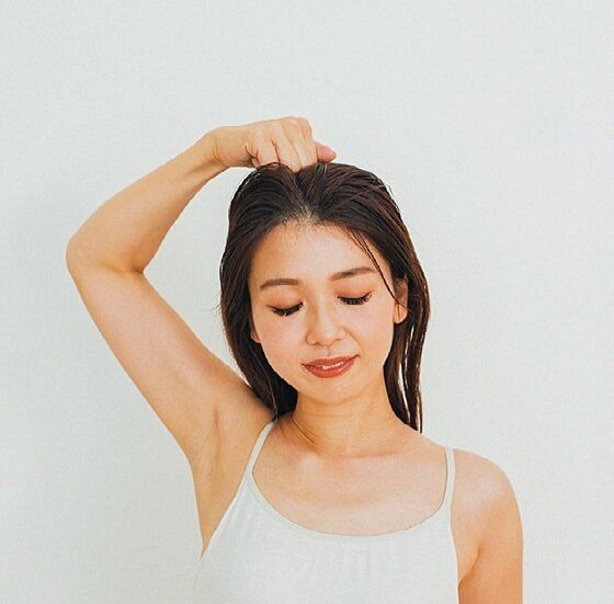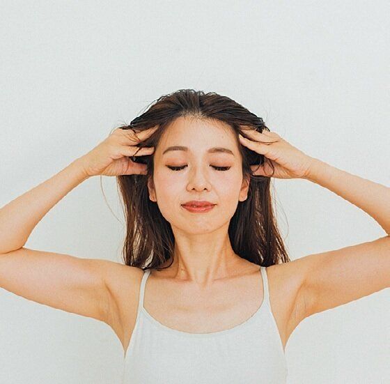 こぶしで頭のてっぺんをぐりぐりとほぐします。次に、指をこめかみから上に滑らせるイメージで髪の中に入れ、頭皮をもみほぐし血行をアップ。