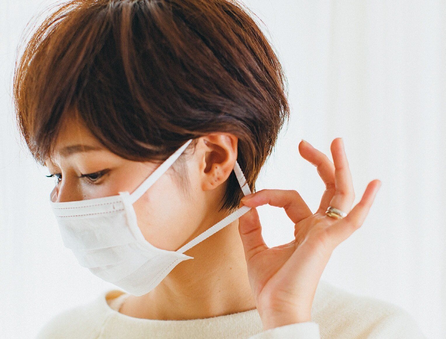 マスクを取るときは、触れる部分を最小限に抑えるよう、耳の後ろ部分のひもに指を掛けてはずしましょう。取りはずしたらすぐに、ふたつきのごみ箱に処分。