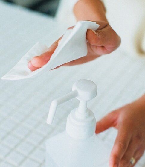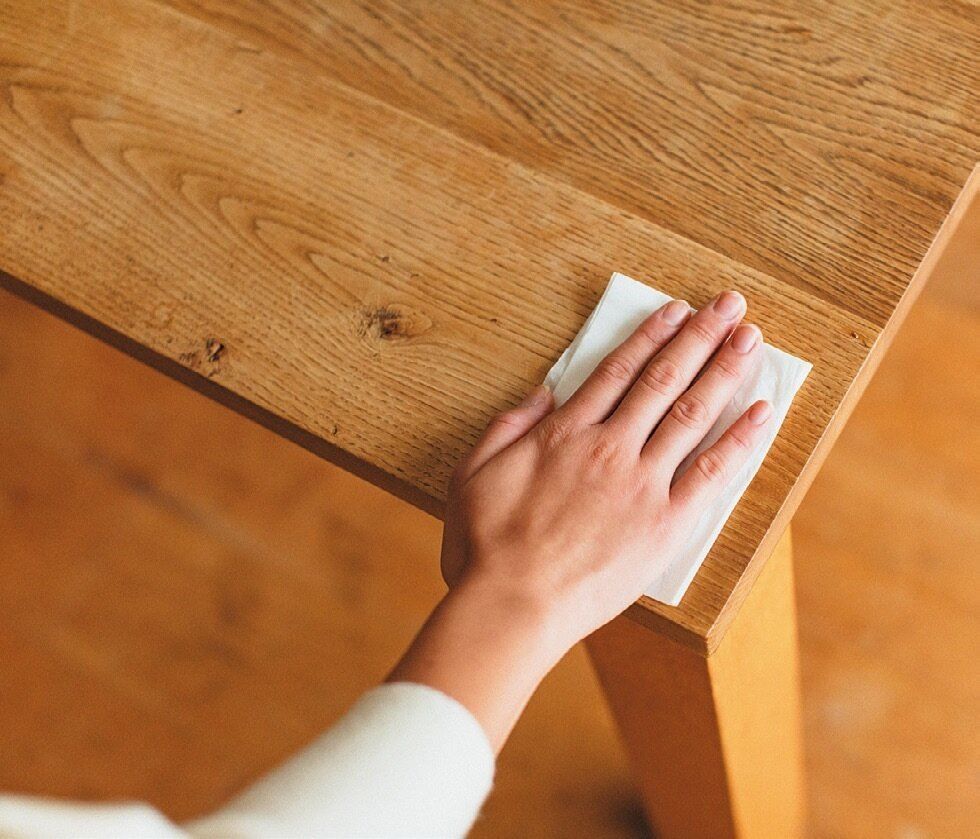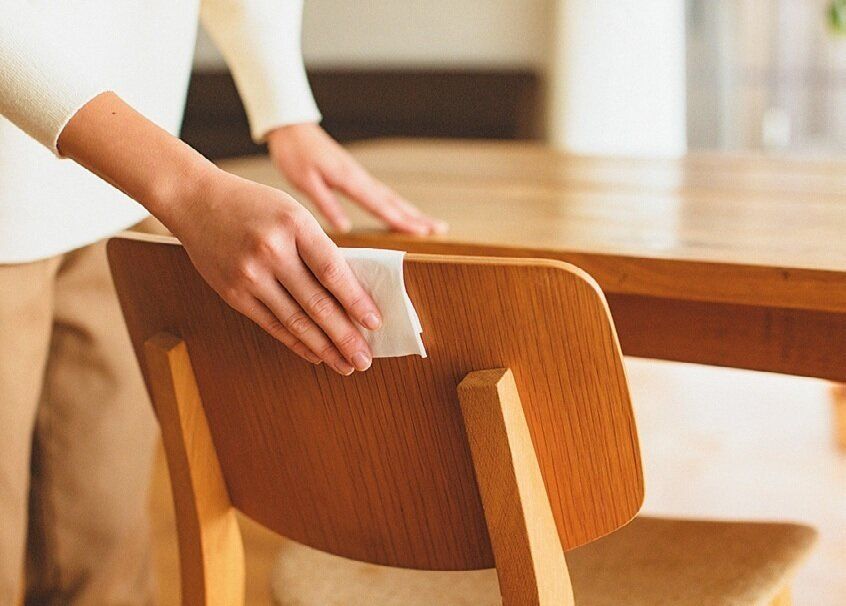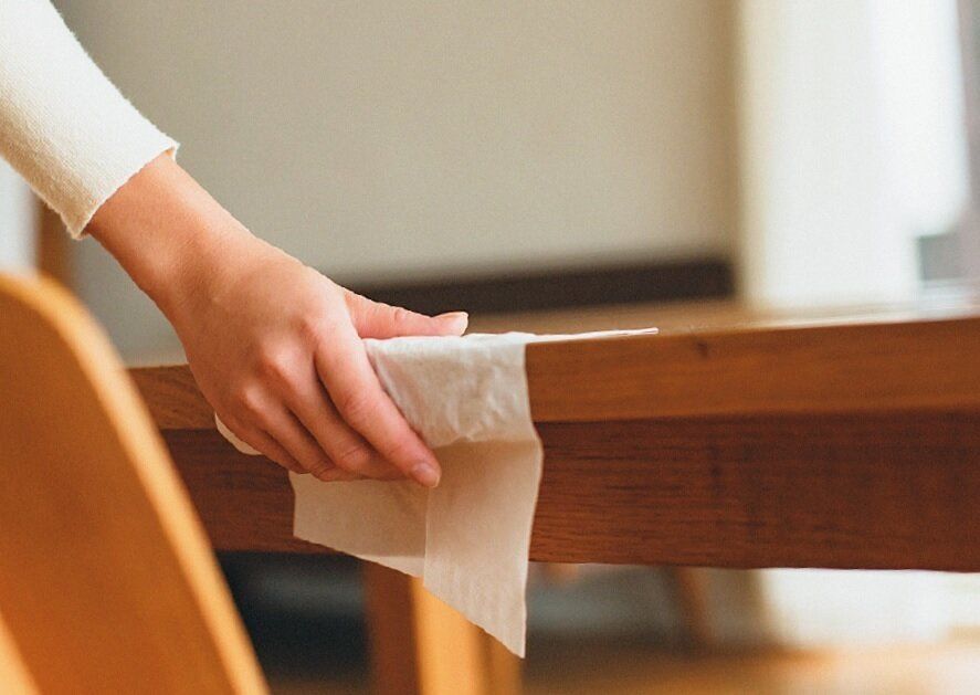 ぺーパータオルや清潔なふきんにアルコールスプレーを吹きかけ、テーブルを消毒。端から一定方向に拭くとウイルスを広げません。表面だけでなく家族がさわる場所も忘れずに。