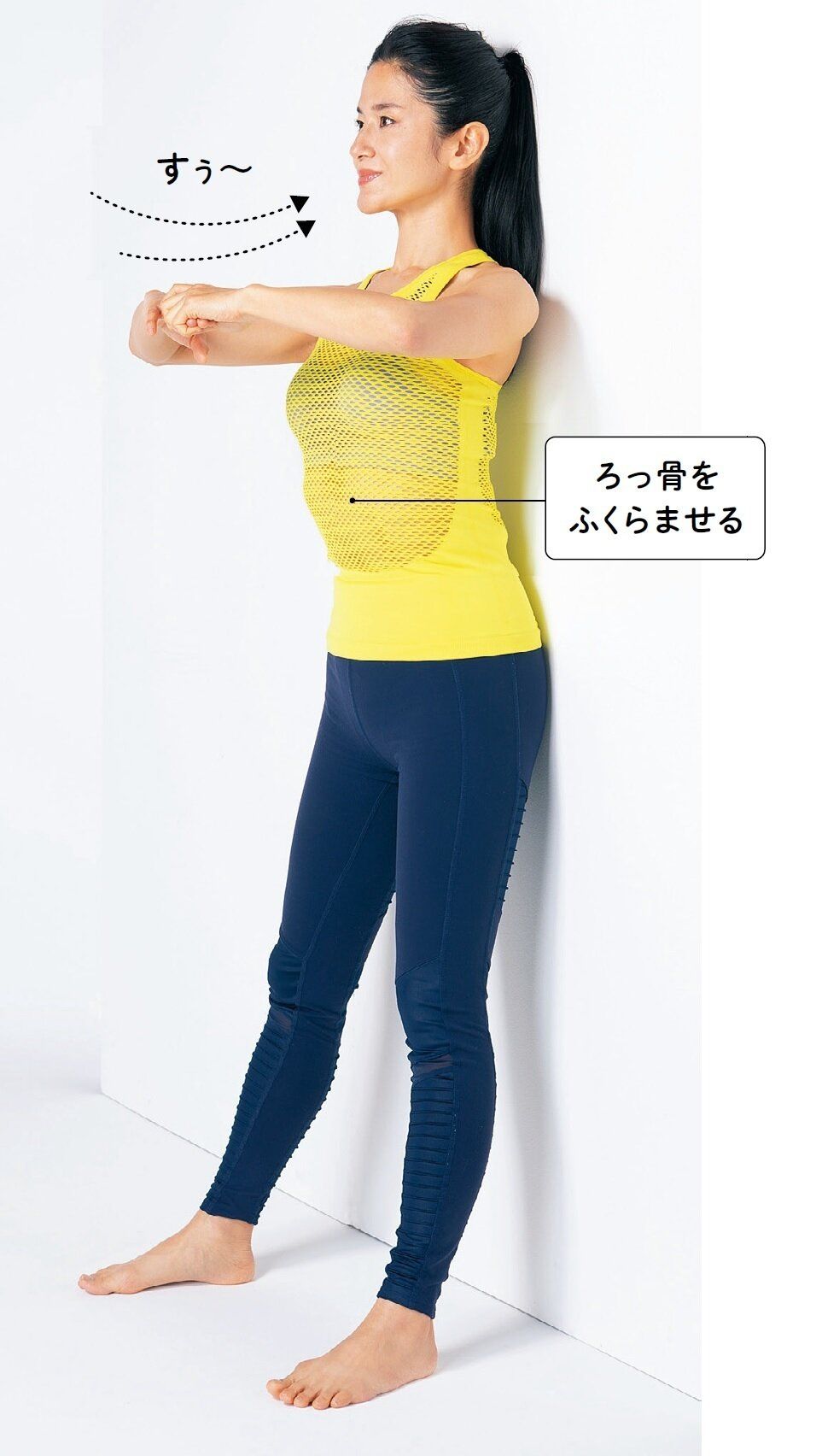 背中を壁につけ、両足を1歩前に出す。肩は上げずに頭を引き上げるイメージで息を吸う。