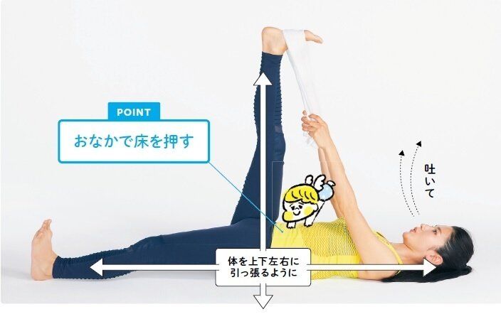 おしり筋を中心に下腹、太もも裏、ふくらはぎと広範囲に効果を発揮。体を引っ張り合うのがコツ!