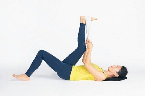 右足を上げてひざを曲げ、胸に引き寄せる。タオルを足裏に掛け、タオルの両端をそれぞれの手で持つ。
