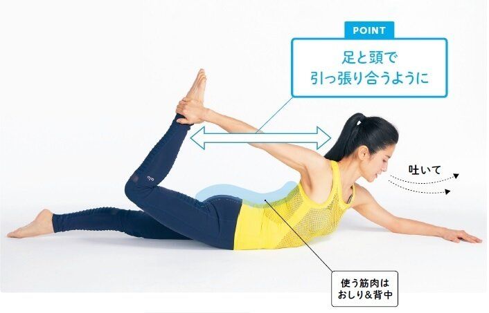 おしり筋と背筋でバランスを取ることで、たるみがちな背中、おしり、太もも裏を刺激!