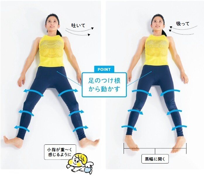 つま先をゆっくり大きく外側に回す。足首もひざも外に向けるように股関節から動かす。