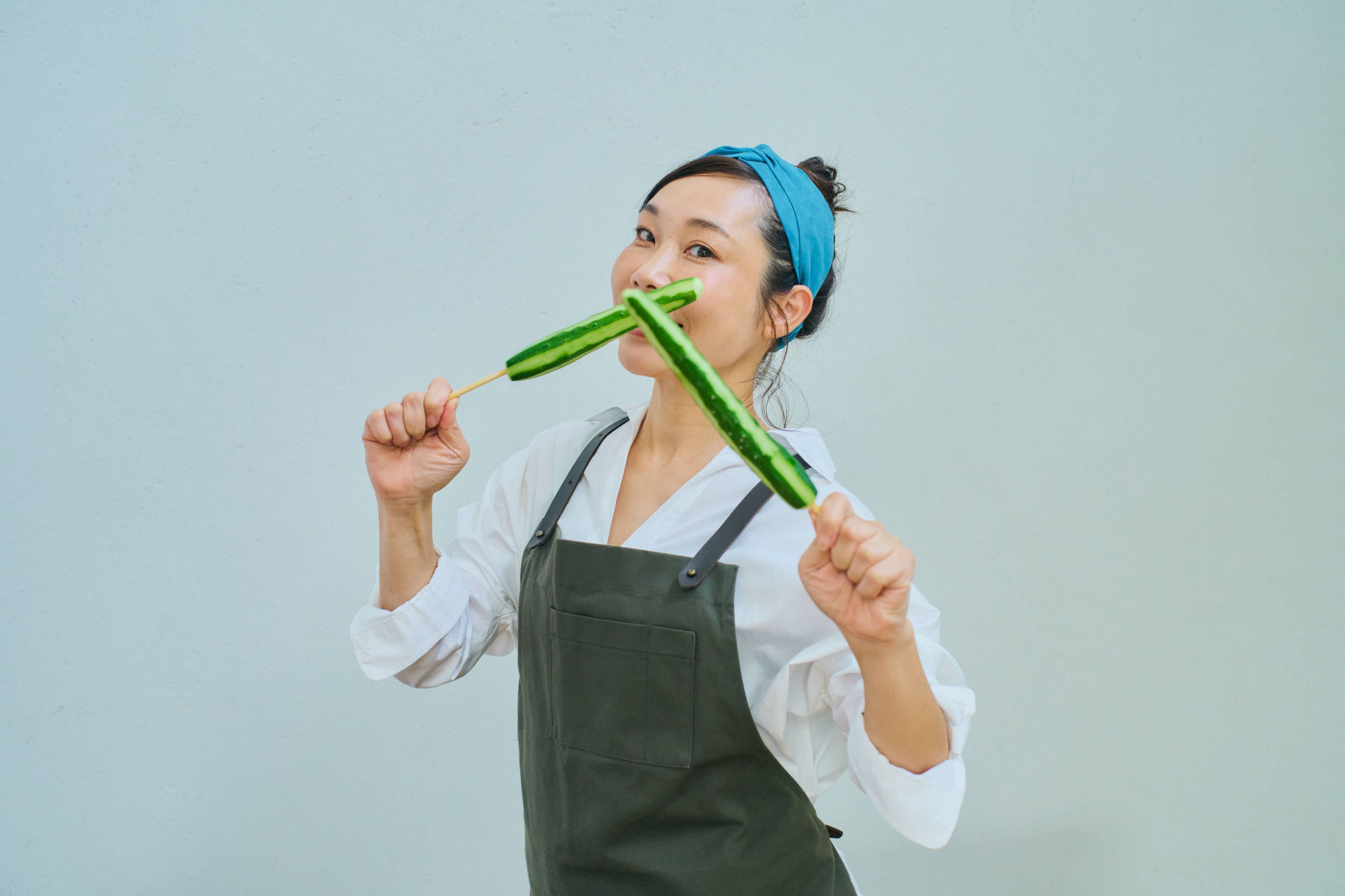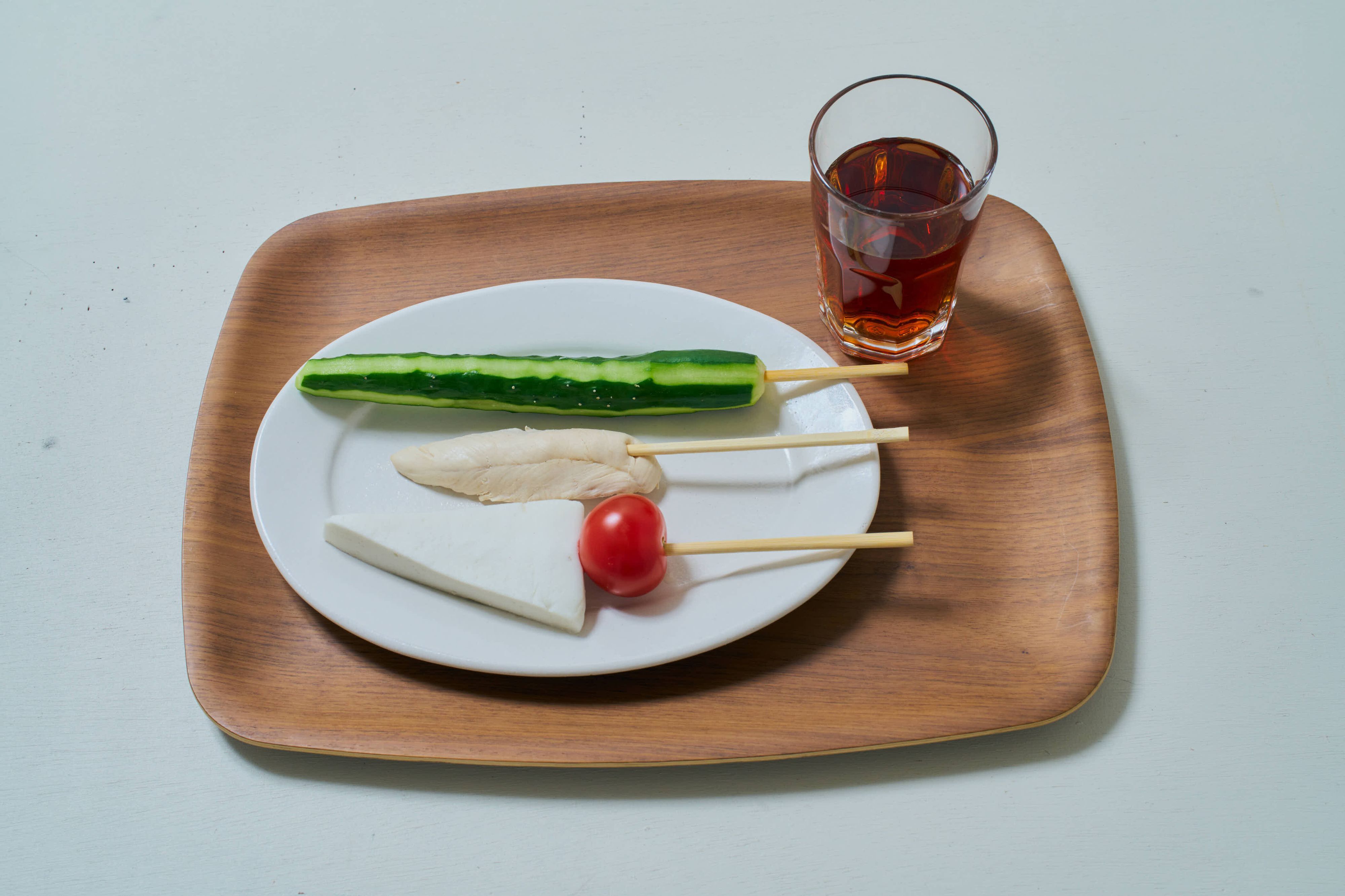 にーよんさんが教えてくれた、100kcal以下のおやつがこちら。なんと、きゅうりをまるまる一本白だしに漬け、割りばしに刺したもの。しかも1本14kcalと低カロリー!さらに、100kcalなら、ささみとはんぺんまで食べられる!