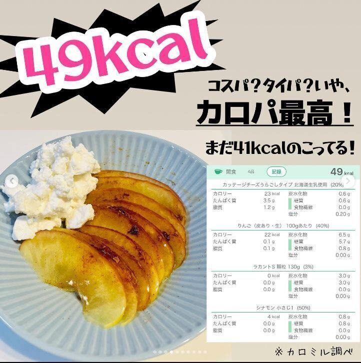 アップルシナモンカッテージチーズ添えは、切ったりんごにシナモンとラカントをかけ、チンするだけ。低カロリーのカッテージチーズを添えたら、まるでカフェで食べるスイーツのよう。しかも41calとカロコス最強。残りの2品も69kcalもバランスよくぴったり100kcalに収まりました。