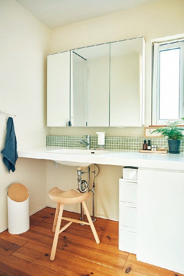 朝の身だしなみ&メイクグッズは、エリアを分けるだけのゆる収納に。キャビネットの扉を閉めれば中は見えないので、ざっくりしまえばOK。
