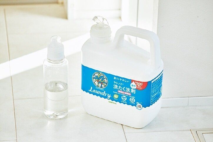 肌が弱い二女のために、洗濯用洗剤は肌にやさしい物をチョイス。シンプルなボトルに詰め替えれば、洗濯機まわりもすっきり!