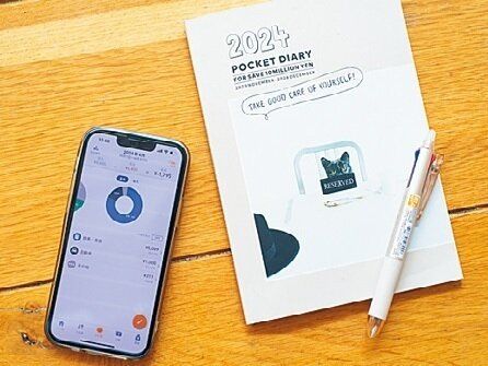 家計簿アプリに全部の口座やクレカを連携し、家計や貯蓄全体をスマホ内で見える化。「アプリだとムダの振り返りはしづらいので、月末にノートに支出を手書きでまとめ、“1人見直し会議”をしています」。