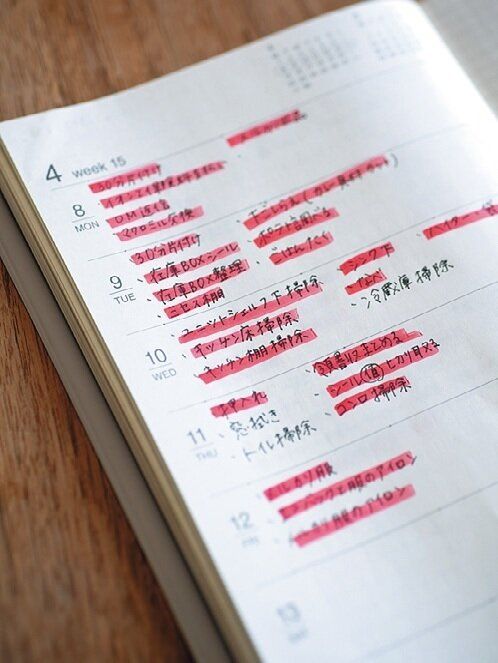 目標達成のために日々やること、その日の仕事や家事の予定を手帳にメモ。「朝書くことで気合が入ります。前日のリストを見て、全部やりきっていると達成感が!ゲーム感覚でタスクをこなしています」。