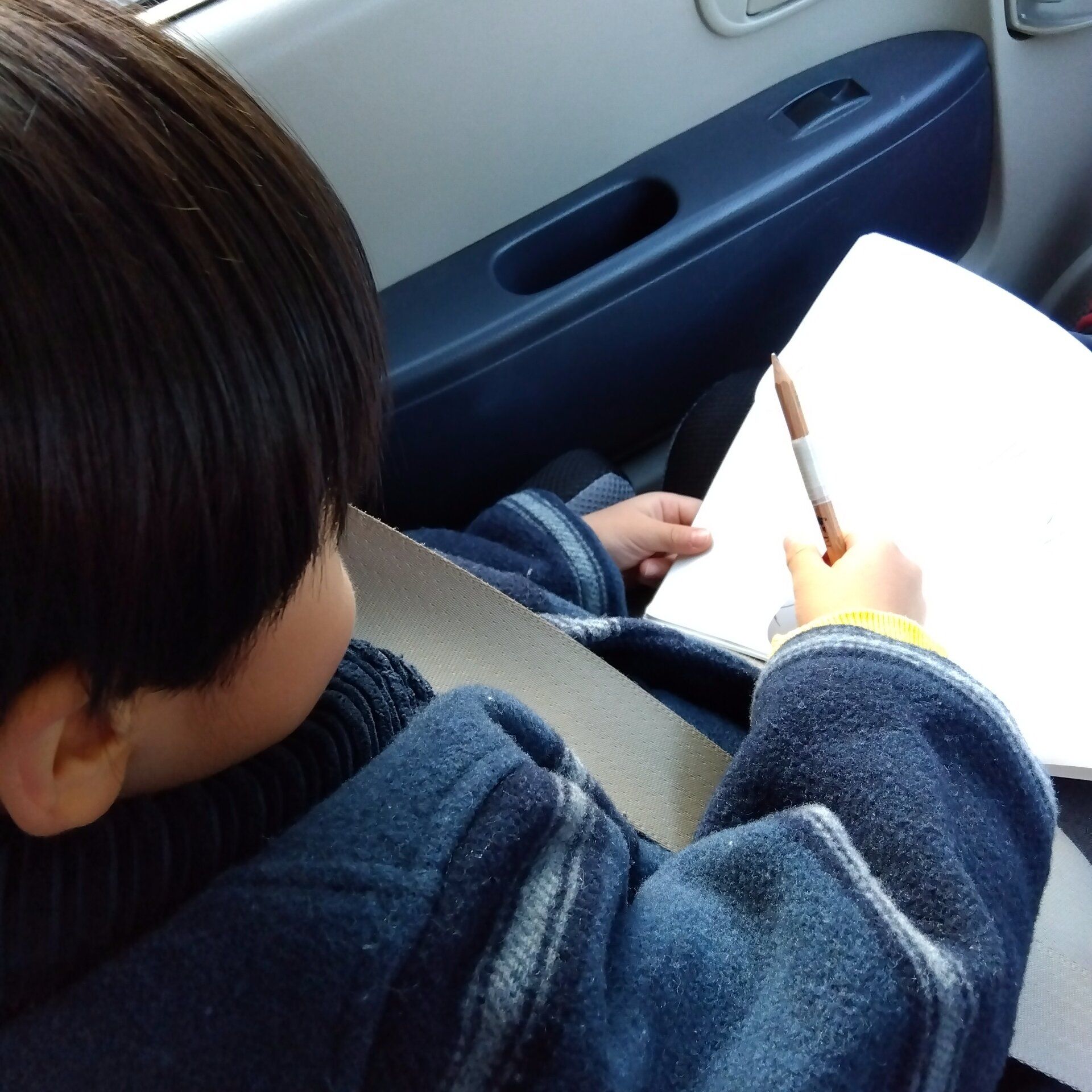 大雨で徒歩で学校に行けない場合など、小学校に車で送って行く日は時間的に少しゆとりがあるので、朝勉強タイムをとっています。