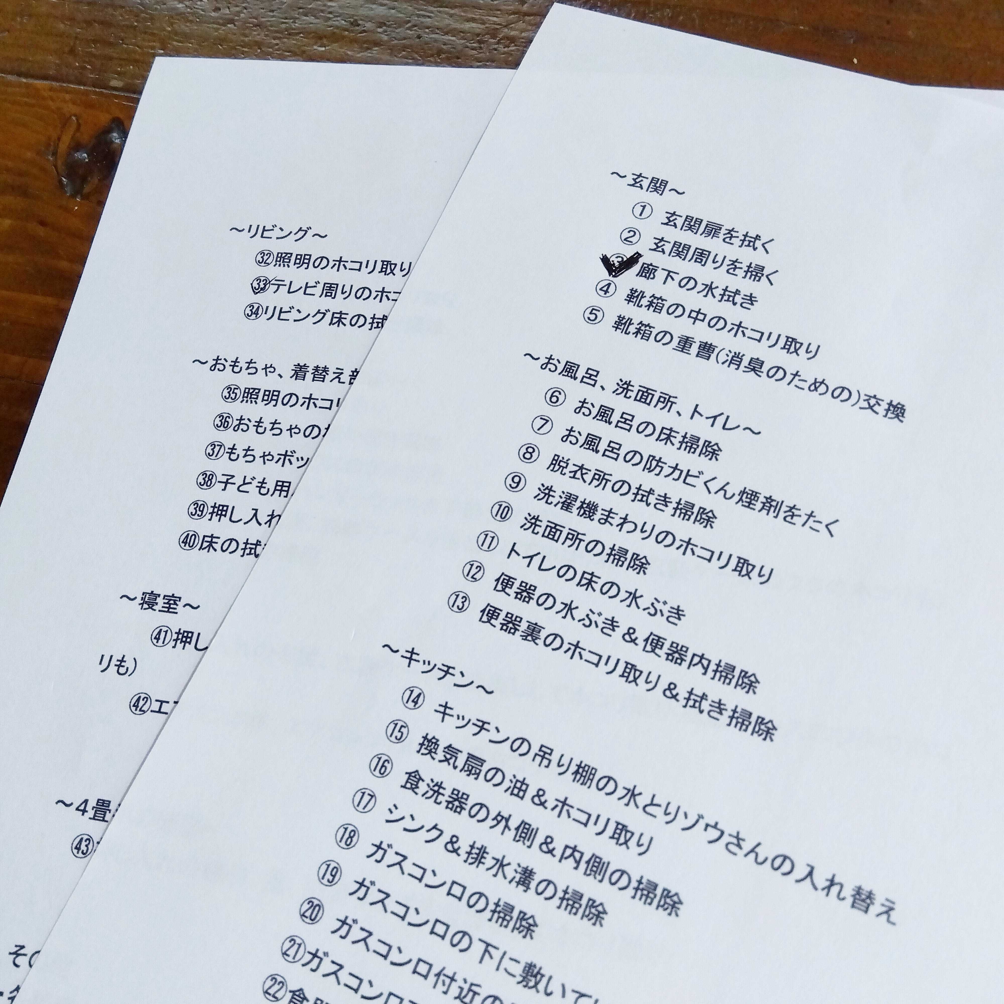 大掃除の一覧表を印刷し毎日少しずつ掃除をすすめ、終わった場所にチェックを入れます。