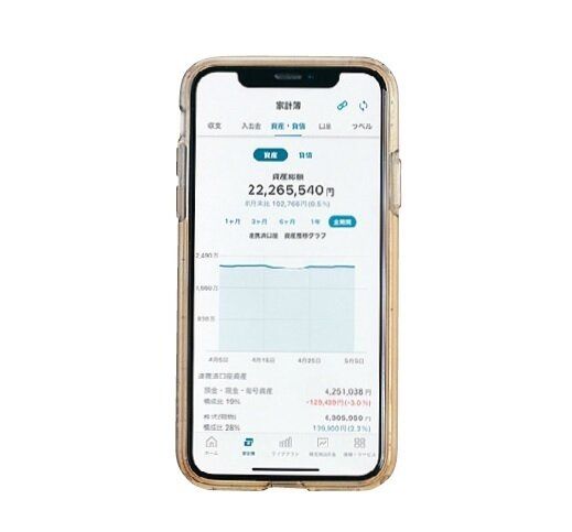 証券口座や預貯金口座を家計簿アプリに紐づけて管理。「株式や投資信託を含めて現時点での総資産額が一目瞭然。実際に金額を目にすると殖えていく手応えがありますね」。