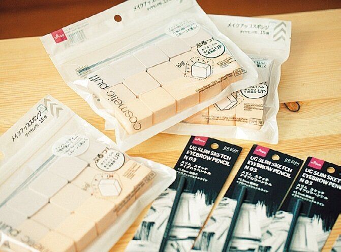 「高いスポンジを洗って何度も使うより、安価でも新品を使い捨てにしたほうが使い勝手が◎」と判断。メイク用スポンジは、100円グッズを採用。
