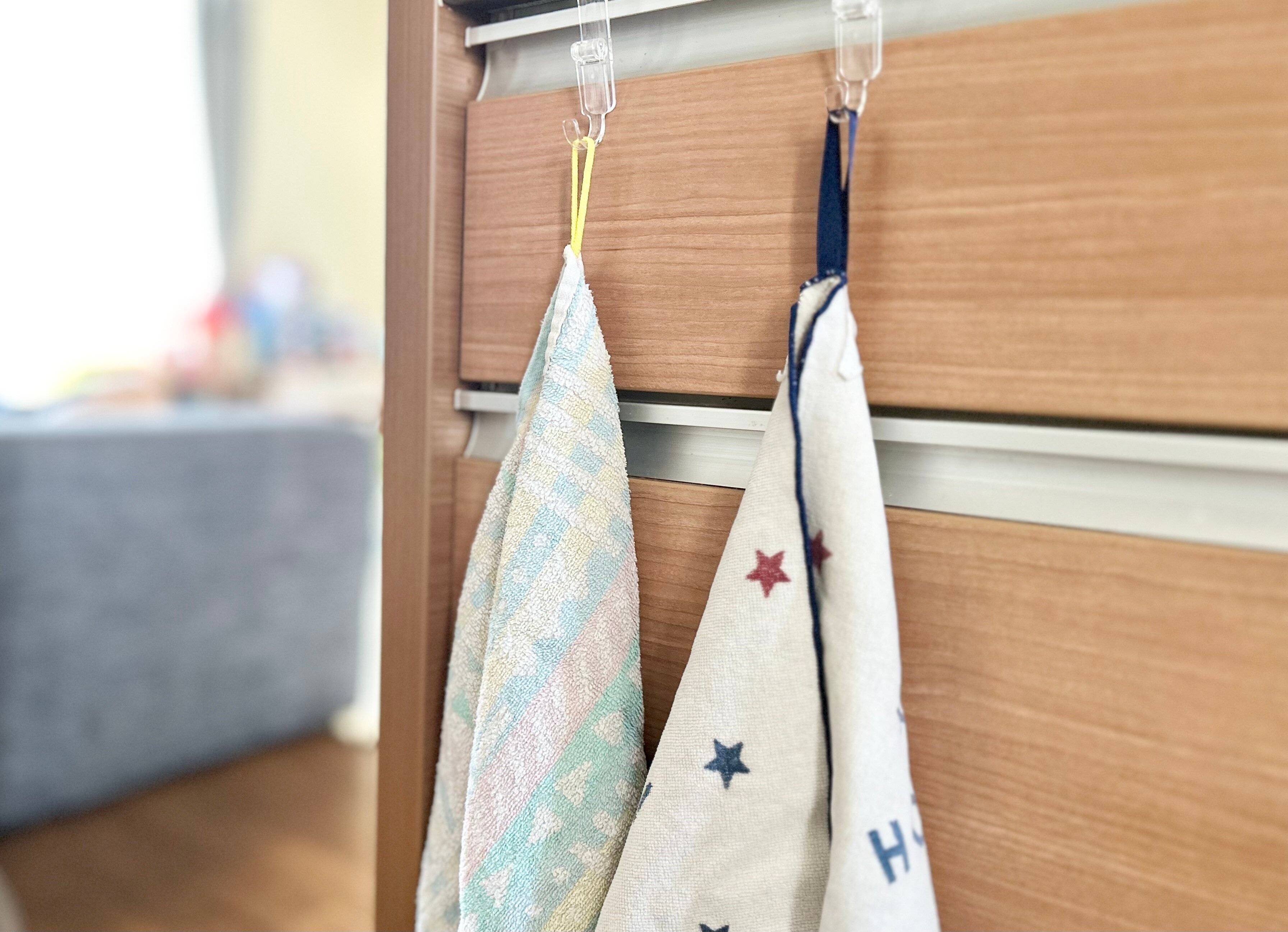子どもの手拭きタオルは、前年に保育園で使っていた手拭きタオルを使用。保育園で1年使い続けたタオルなので「自分のタオル」という意識がついているのでおすすめです。