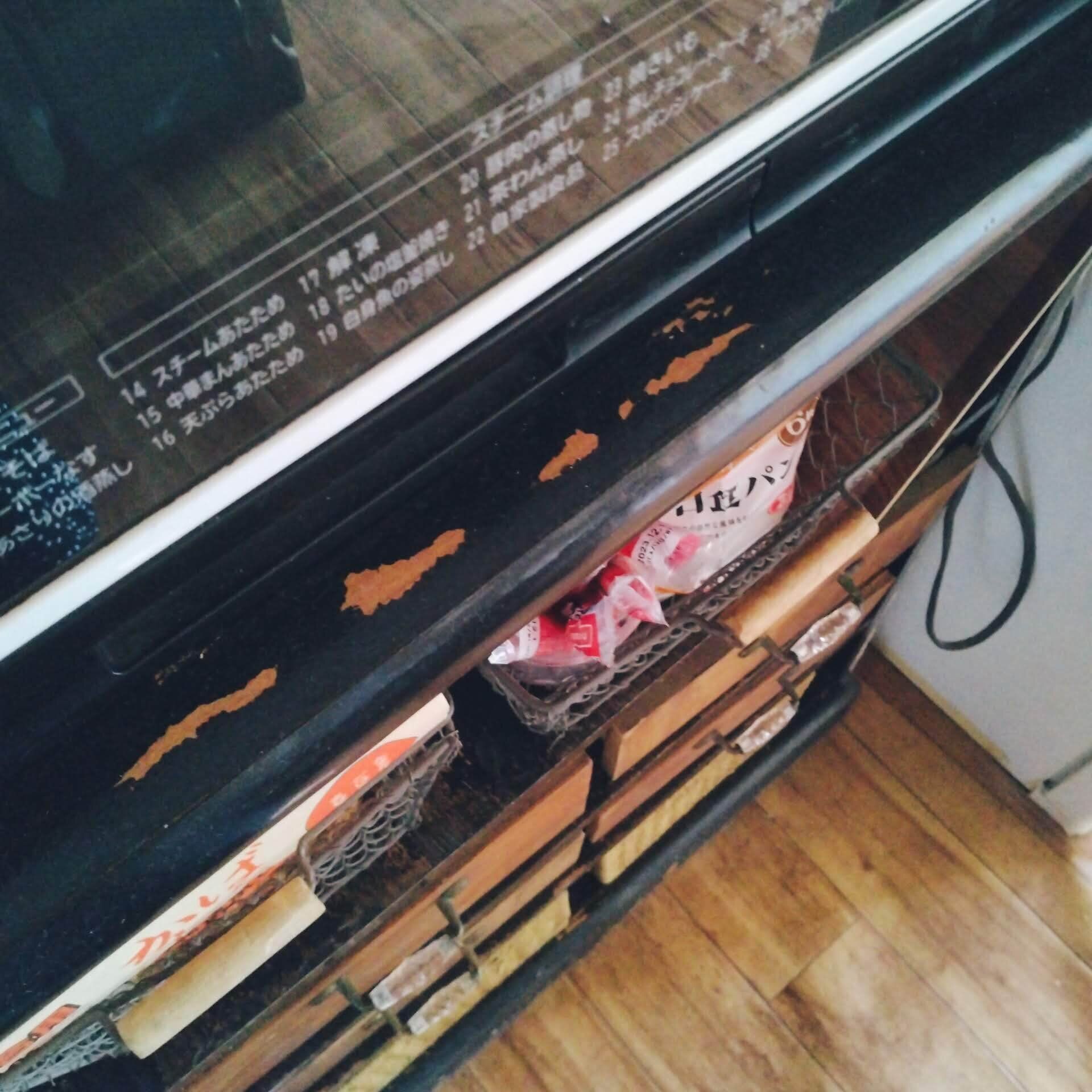 10年以上使っている電子レンジ台。経年劣化で塗装が剥がれてきたので、油性ペンでハゲ隠し。所要時間は約30秒。