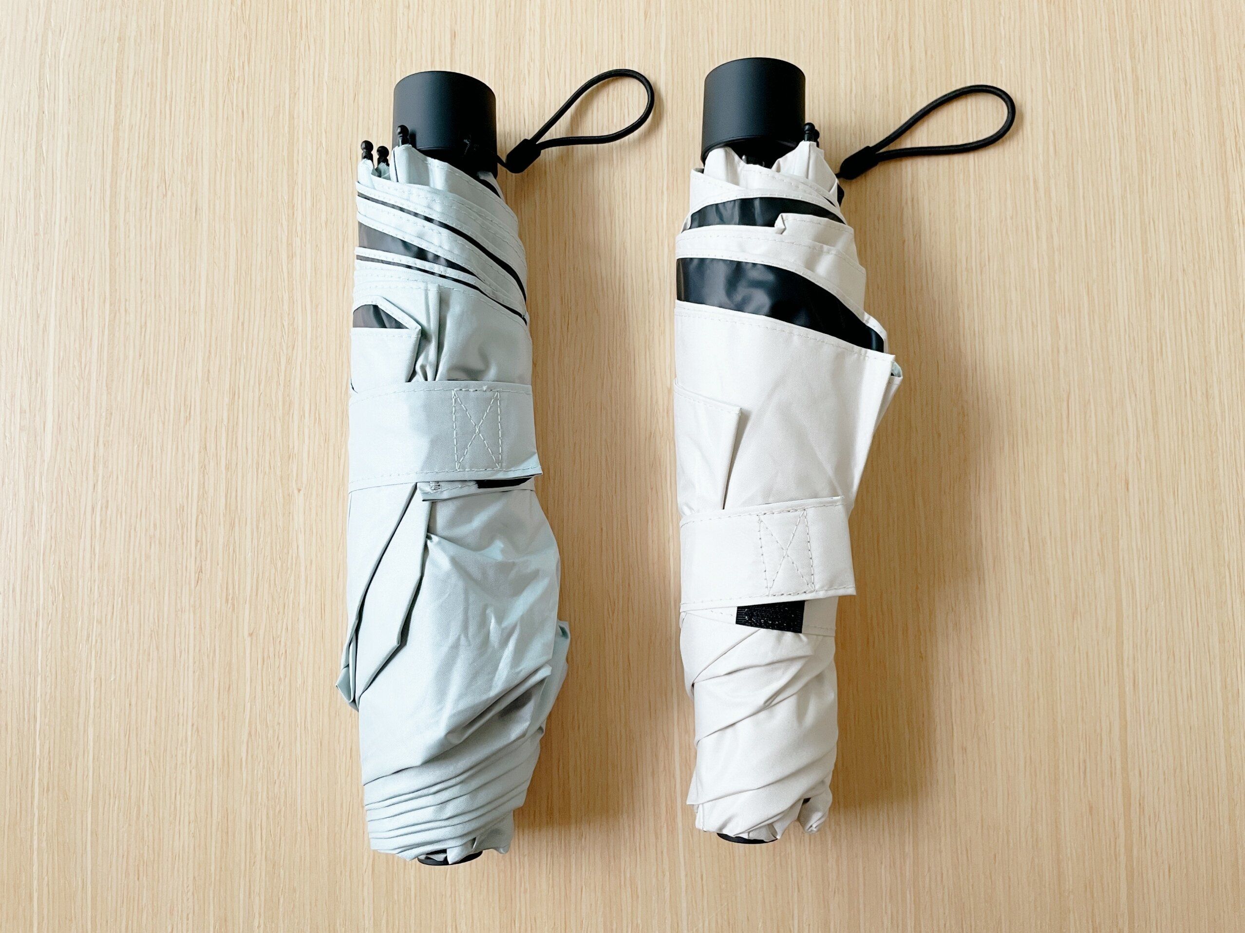 通常の傘も晴雨両用なのですが、急な雨に備えて常に持ち歩いている折り畳み傘も晴雨両用のものに変えました。朝よりも帰宅時の方が日差しは強めなことが多いので、キャップだけでは不十分なときは、傘の裏地にブラックコーティングで99.9%日差しと紫外線CUTしてくれる傘をさして帰ってきています。