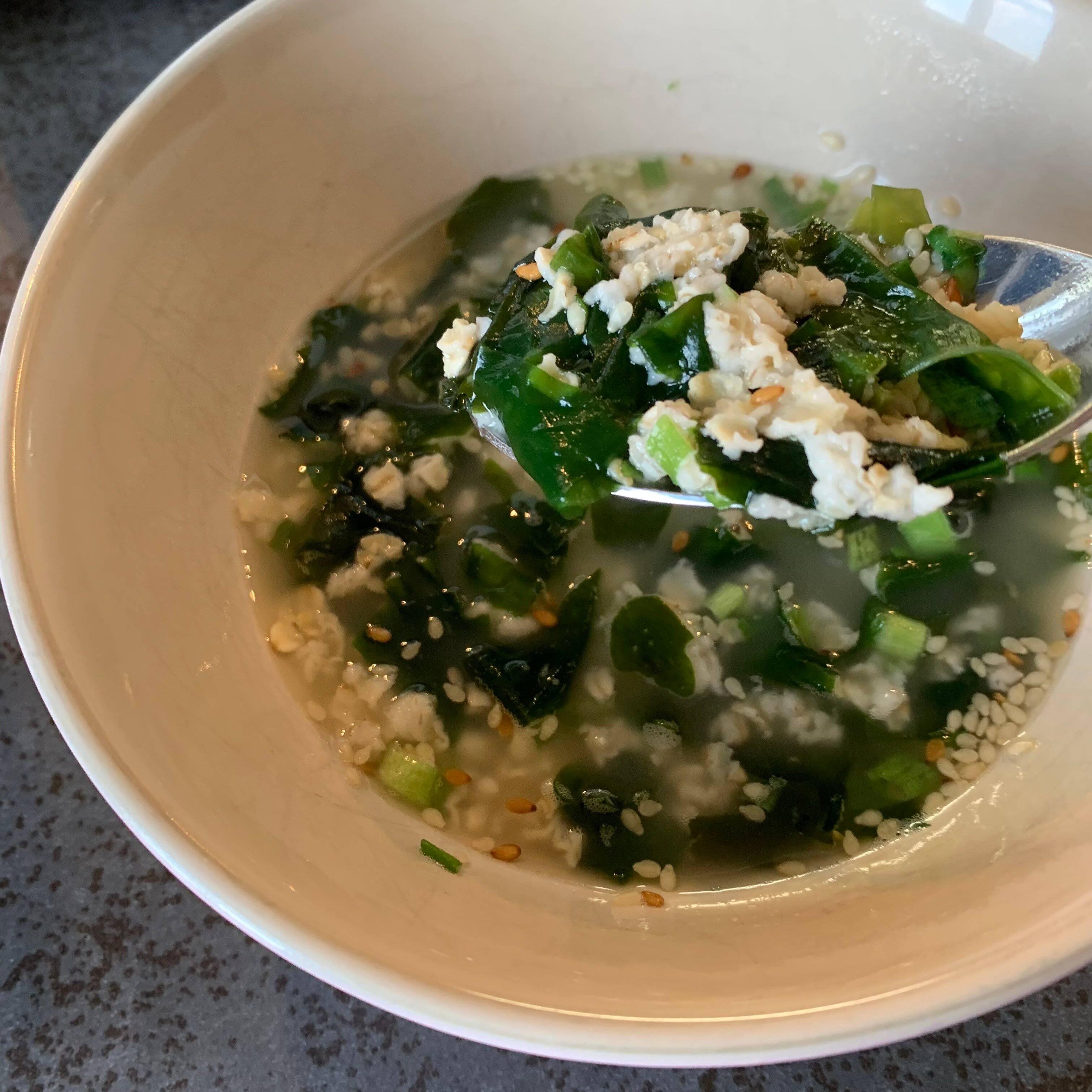 2分待てば、わかめたっぷりのオートミールおじやの完成。スープにはホタテの風味がきいているので、食べ応え抜群です。