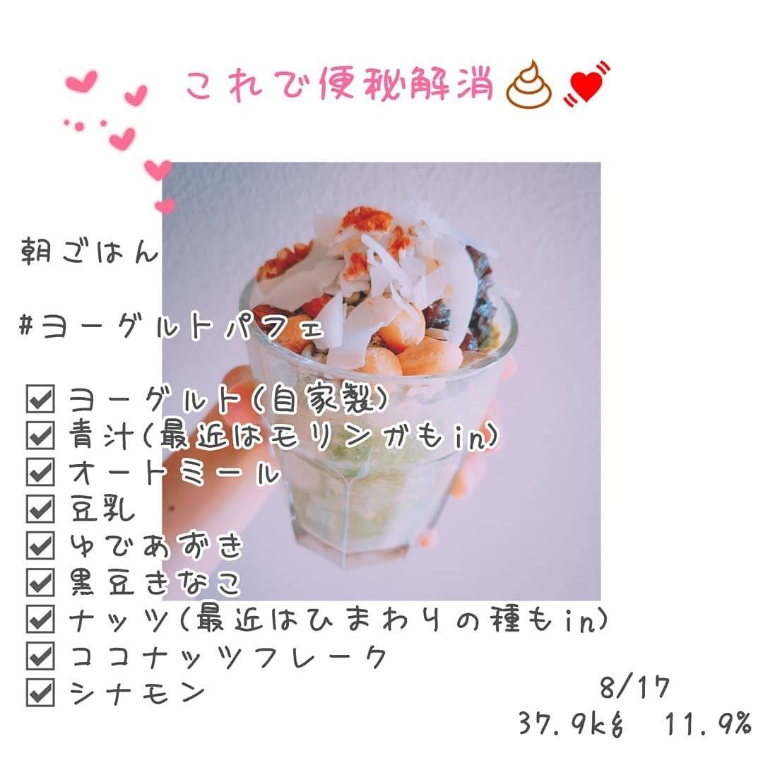 朝ごはんによく食べているのが、こちらのヨーグルトパフェです。つくり方は、自家製のヨーグルト、青汁、オートミール、豆乳に、ゆであずき、黒豆きなこ、ナッツ、ココナッツフレーク、シナモンをトッピングするだけ。毎朝これを食べることで、便秘解消に効果が感じられたのだとか。
