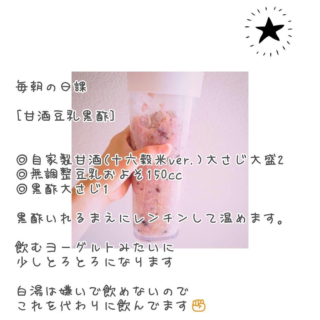 また、毎朝の日課として甘酒豆乳黒酢を飲んでいます。自家製の十六穀米甘酒と無調整豆乳を電子レンジで温めてから黒酢を混ぜ、飲むヨーグルトのようにトロッとしたら完成。毎日欠かさず飲んでいたおかげか、ツルツルもちもちの美肌をキープでき、ダイエットでありがちなトラブルも起きなかったそうですよ。