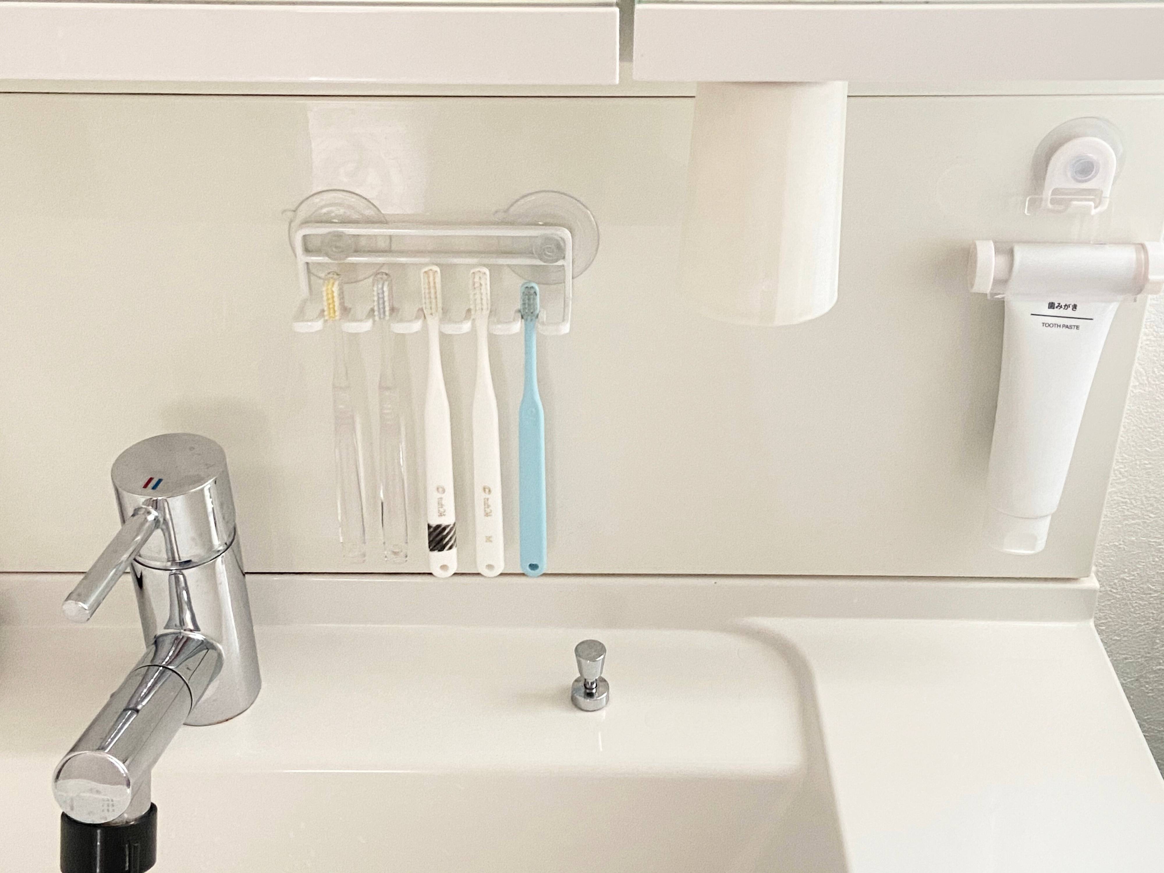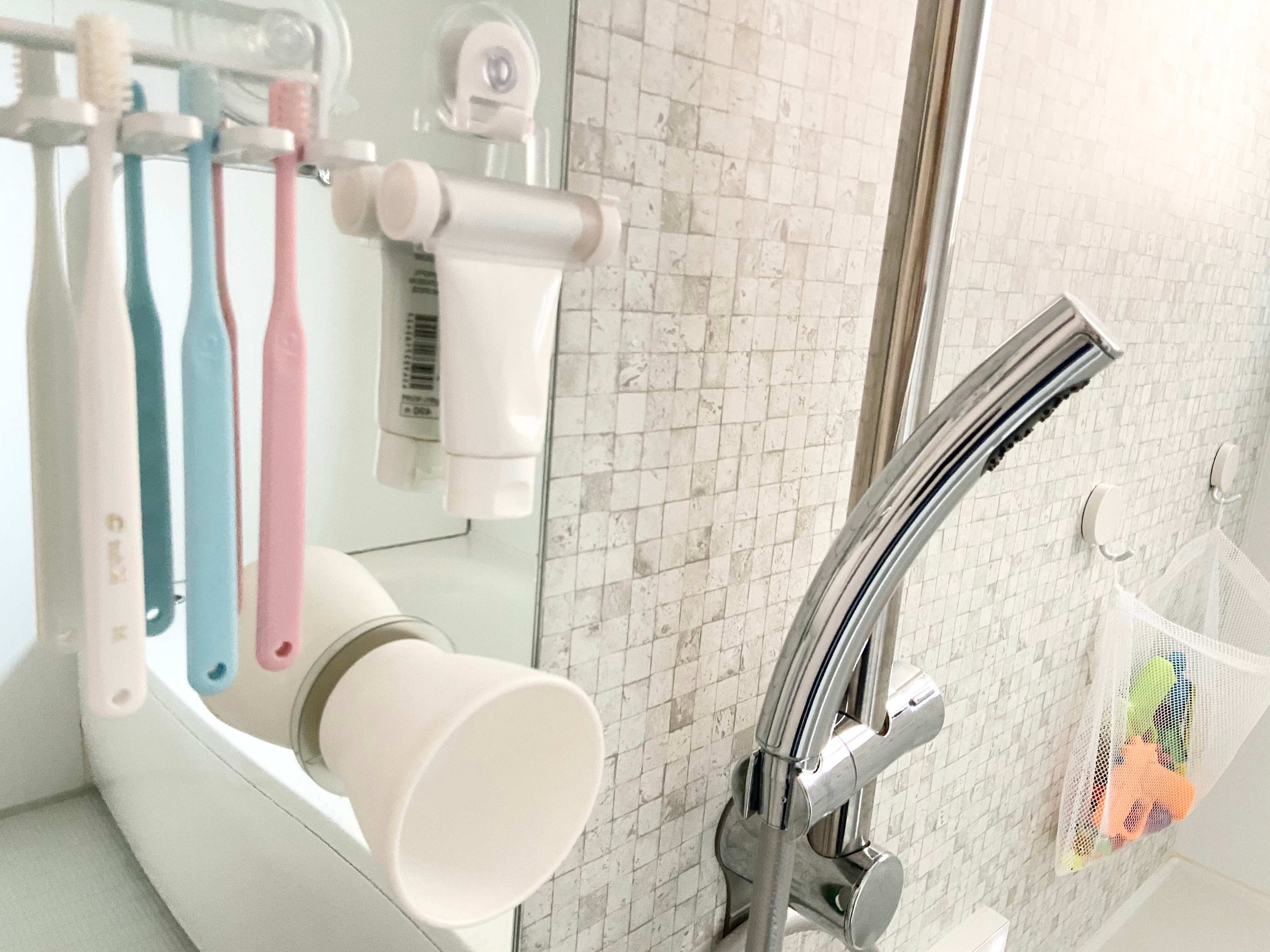 ポイントはお風呂場にもちゃんと歯磨き粉と歯ブラシ、コップをセットしておくこと!持って入るなどの1手間が加わると、好きなことならできますが、そうでもないことは続けることができません。いかにノンストレスと少しのアクションでやれるかが習慣化のポイントになります!
