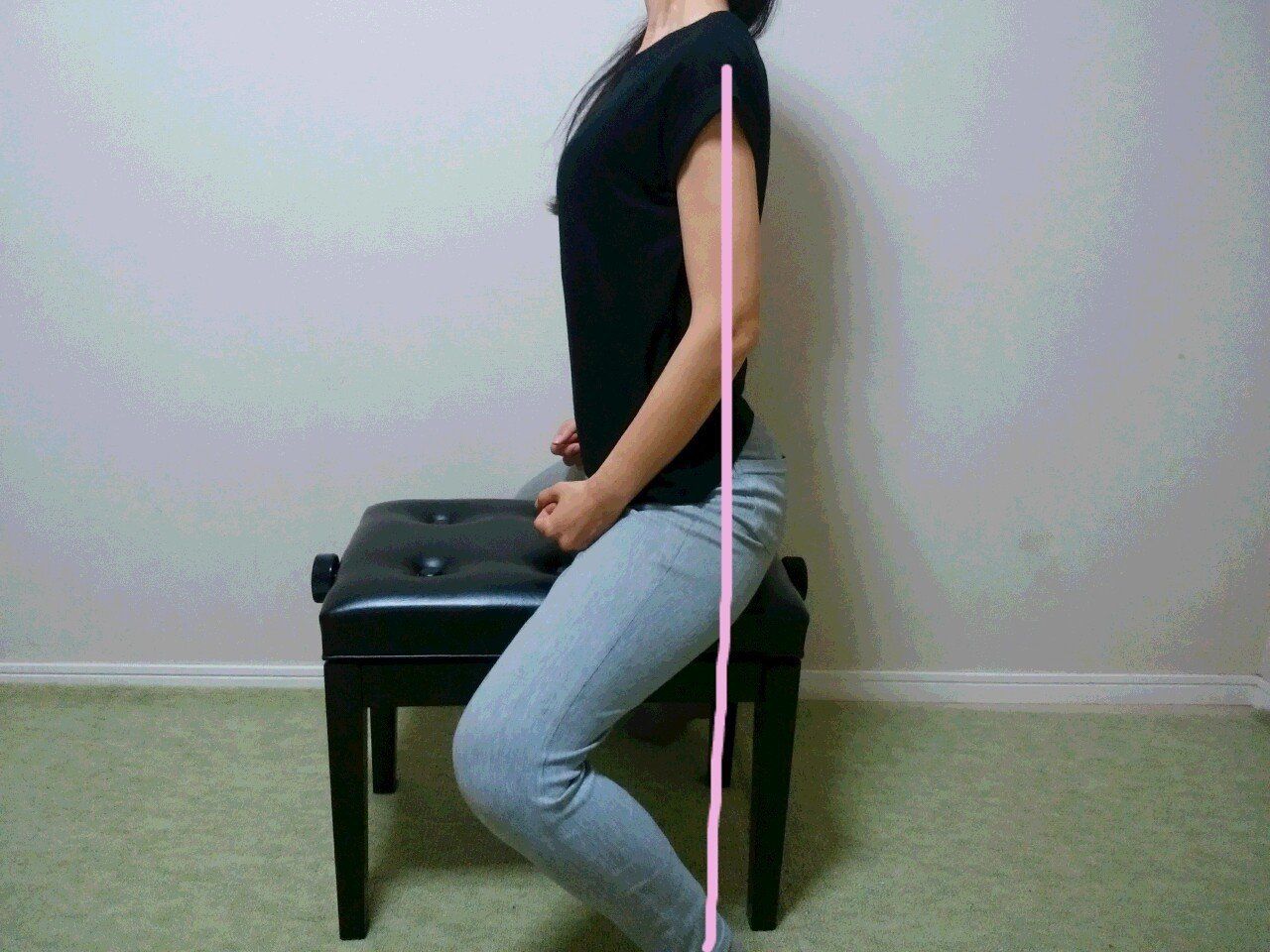 父からの遺伝でお尻の肉に厚みがあるためわかりづらいですが、私自身の感覚ではこれでまっすぐ。