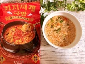 1.耐熱容器に、豆腐1パック、キムチ大さじ1、乾燥わかめをひとつまみ、鶏がらスープの素小さじ1/2、醤油小さじ1/2、水120mlを入れます。