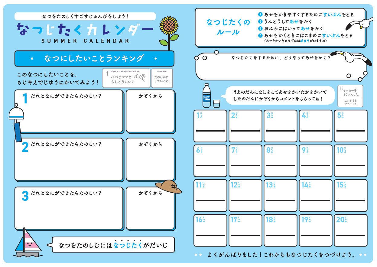 今、親子で一緒にできる「なつじたくカレンダー」を無料配布中♪ カレンダーには、夏にしたいことを書きこんだり、汗をかけた日のチェックができ、親子でコミュニケーションを取りながら、楽しく熱中症対策に取り組めます。「子どもと一緒にスポーツをする計画を立てられて、ワクワクしてます♪」と浅野さん。今から熱中症対策をして、夏を健康的に過ごしましょう!
