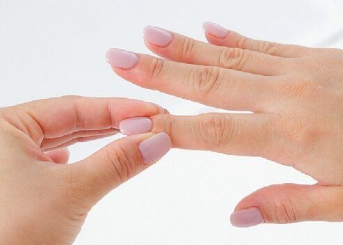 手指の爪の生え際を反対側の手の親指と人さし指で挟み、各指を約10秒ずつギュッと押す。反対の手も同様に。