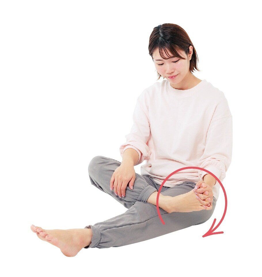 (1)床に座って、右足を左足の太ももに乗せ、左手の指を右足の指の間に入れてつかみ、ぐるぐると5回ほど回す。反対回しも行う。