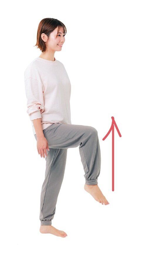 背筋を真っすぐ伸ばして立ち、左の太ももが床から直角になるくらいまで上げる。約5秒キープし、太ももをゆっくり下ろす。これを10回繰り返す。反対の足も同様に行う。