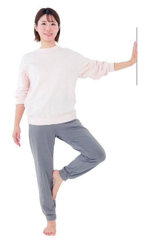 背筋を伸ばして立ち、片方の手を壁につける。壁側の足を外向きにして反対の足に付け、片足立ちで1分間キープ後、足を下ろす。反対向きになって、反対の足も同様に行う。
