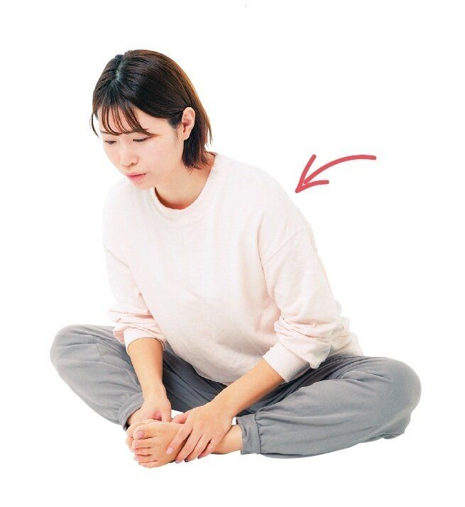 床に座った状態で膝を外向きにして、足裏を合わせる。手で足首を持ち、深く息を吸う。息を吐きながら上体をゆっくり前に倒し、息を吐ききったら、元に戻す。