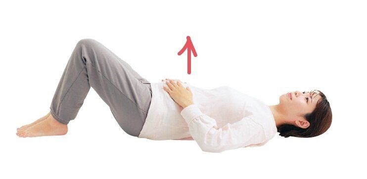 (1)あおむけで膝を立て、両手をおなかの上に乗せる。おなかを膨らませながら、ゆっくりと鼻から息を吸い、約5秒停止。