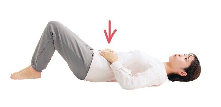 (2)ゆっくりと口から息を吐きながら、おなかをへこませる。息を吐ききったらおなかを緩める。