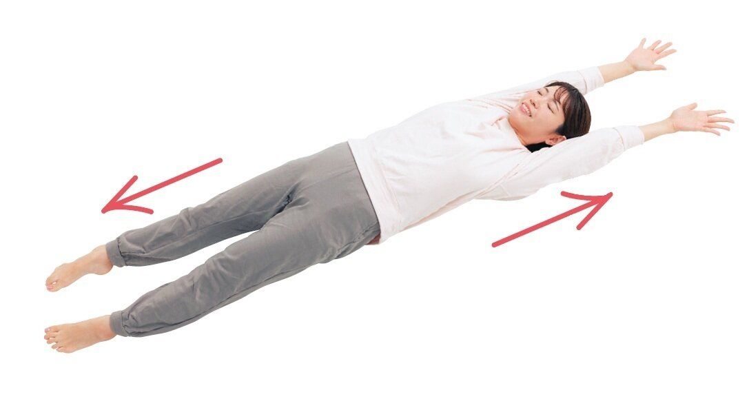 あおむけで、両手を上に上げて手のひらを上向きに。つま先を伸ばして、全身を上下に思い切り伸ばす。伸ばし切ったら、一気に脱力する。
