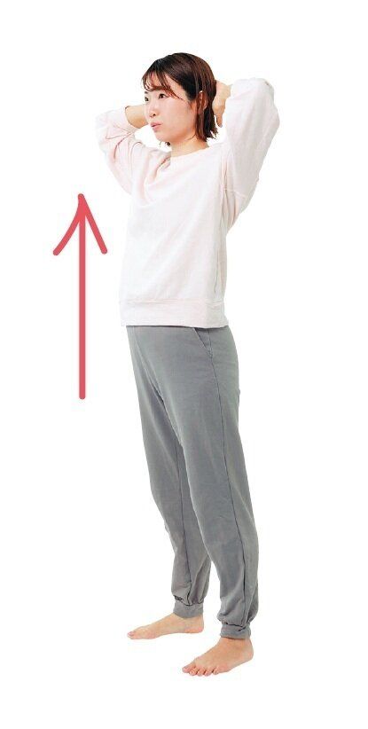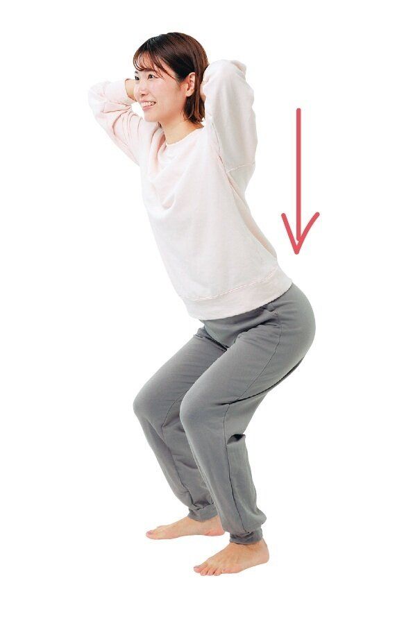 (1)背筋を伸ばして足を肩幅に広げて立ち、両手を組んで頭の後ろに。鼻で息を吸いながら、お尻を突き出すように膝を曲げる。
