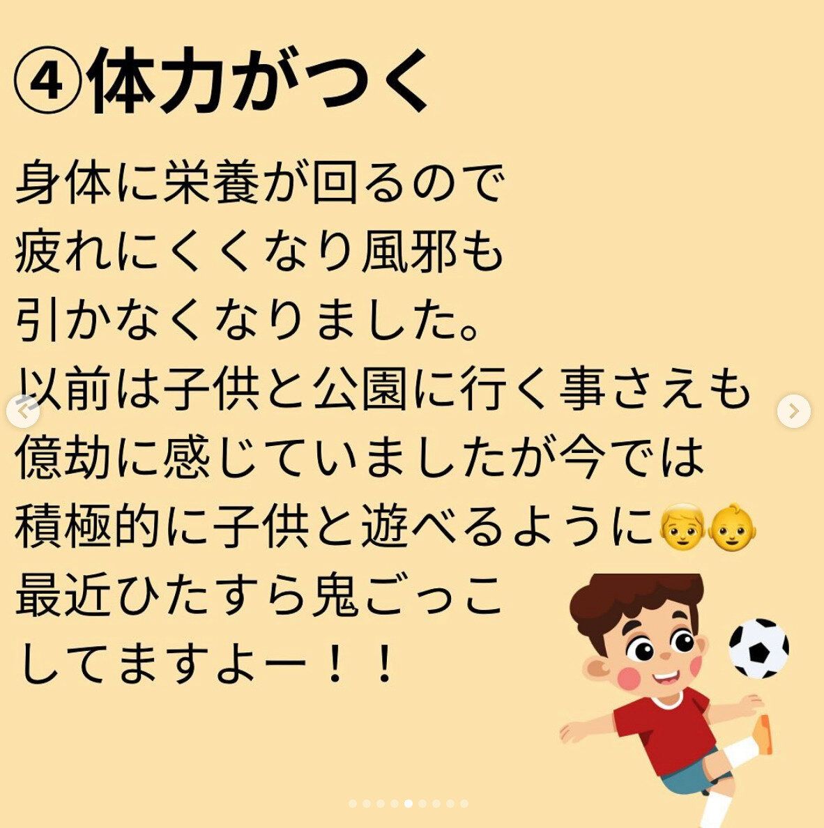 体に栄養が回るので疲れにくくなり、風邪もひかなくなったといいます。管理栄養士のm_0808_mさんは、以前は子供と公園に行くのも億劫だったそうですが、今では子供と鬼子っごができるまで体力がついたそう。、