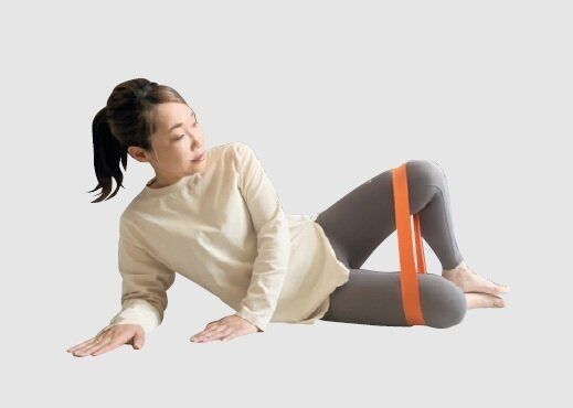 横になったら、息をするようにひざ上にトレーニングチューブをセット。足を動かすだけで、エクササイズに!