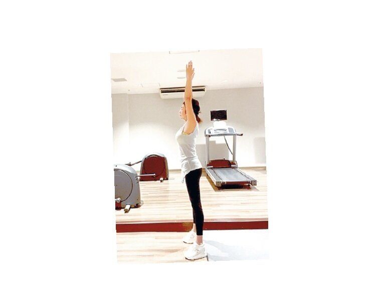立って腕をまっすぐ上げ、天井から手を引っ張られるような感覚でお腹を伸ばし、鼻から息を吸い、腕を上げきったら口から息を吐きながら5秒キープ。