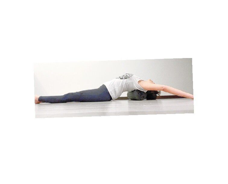 仰向けで背中の肩甲骨のあたりにローラーや丸めたタオルを当てて腕を上げ、お腹をグーッと伸ばします。「あごを上げて頭を床につけると脇腹まで伸びます」。