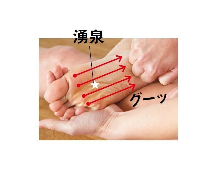 片手を握り、第2関節を足裏の指の付け根に当て、かかとに向かって全体を強めにこすります。足裏の脇も刺激。