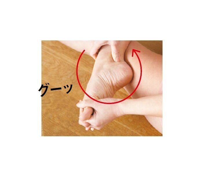 足指に片手の指を入れて握り、反対側の手の親指で内くるぶしの後ろを押して足首を回します。内・外回し各5回。