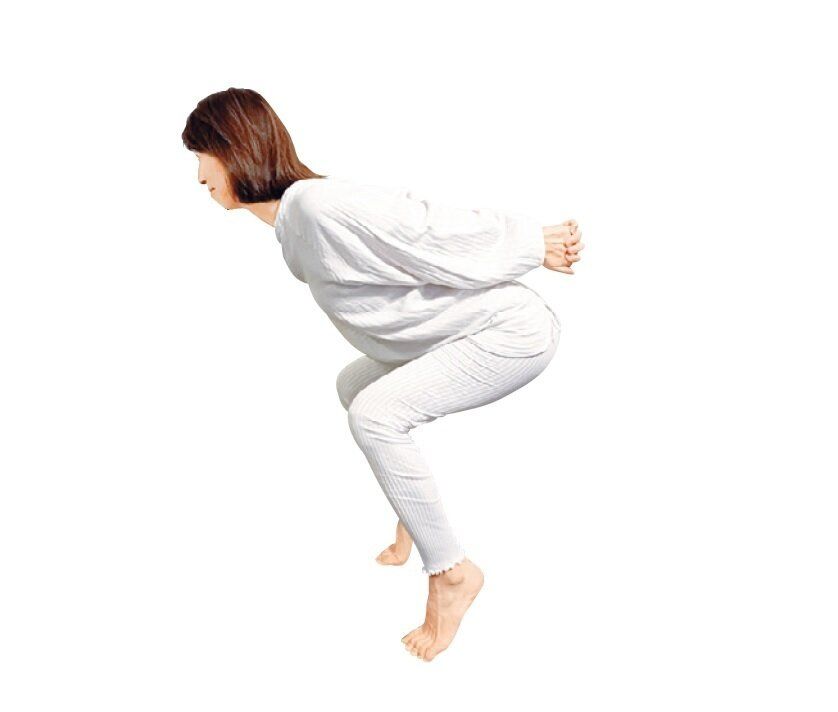 お正月太りを戻すときに短期集中で行うのがこのポーズ。「洗濯機を回す間などに、しゃがんで和式トイレの腰使いで、お腹を引っ込めて30秒ふんばります。洗濯機の高さより低い位置で行うのを目標に。下半身の引き締め効果大」。