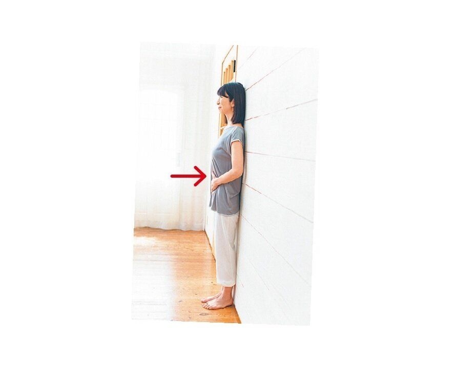 テレビを見ているときは、お腹を凹ます“ドローイン”を。「壁に体全体を押し付けて立ち、肩を引いて通常の呼吸をしながら、10秒かけてお腹をギューッと凹ませたら、さらに10秒凹まし、最後の10秒でもっと凹ませます」。